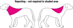Migration from the site of implantation is now classed as an adverse event, and there is some logic in this in that it enables problems with certain brands or batches of microchips, or with the technique of certain implanters, to be detected. However, as there is no requirement to record the site of microchip implantation on the animal’s record or microchip database, actual migration – as opposed to incorrect placement at initial implantation – is difficult to ascertain. For this reason we recommend that unless the veterinary surgeon has more detailed evidence on implantation site, for example from their own records or through entry in a Pet Passport, microchips located within the areas indicated in red on the diagram below (which covers the recommended UK and European sites for implantation and allows for minor errors of positioning at implantation) do not need to be reported as having migrated.